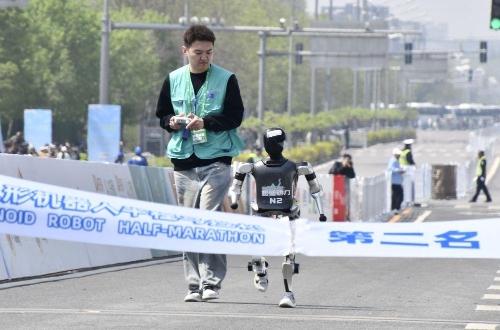 4月19日,在2025北京亦庄半程马拉松暨人形机器人半程马拉松比赛中,小顽童队选手松延动力N2(右)冲向终点。新华社记者李欣 摄