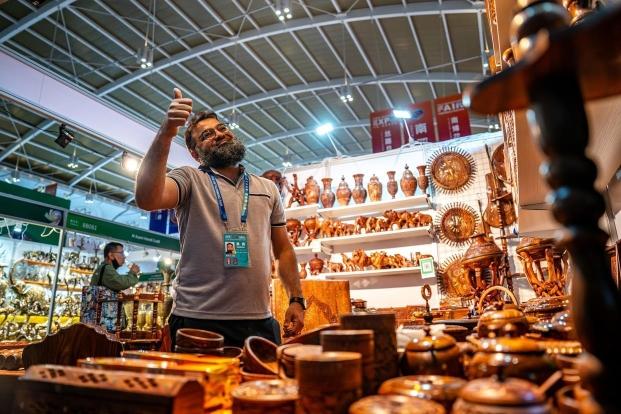 6月20日,顾客在南亚馆巴基斯坦展区选购铜制工艺品。新华社发(彭奕凯 摄)