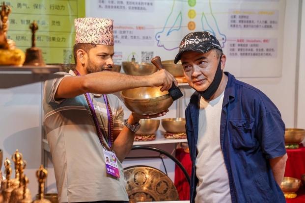 6月21日,顾客在南亚馆尼泊尔展区体验颂钵。新华社发(彭奕凯 摄)