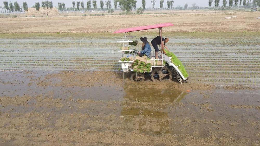 在河南省新乡市原阳县太平镇,种植户们在插秧机的助力下,抢抓农时,进行水稻插秧。受访者供图