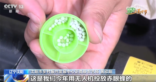 沈阳市乡村振兴发展中心正高级农艺师黄欣阳向记者介绍:“这是一个蜂球,这是我们今年用无人机投放赤眼蜂的一个载体,每颗蜂球里放着70颗以上的柞蚕卵,每颗柞蚕卵可以孵化出80头左右的赤眼蜂。一个球能孵化出5000头以上,一亩地放两枚蜂球,总共释放两次赤眼蜂,每亩地达到两万头的总放蜂量。”