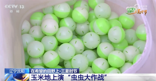 这个长相酷似乒乓球的绿色小球就是当地用来对付害虫玉米螟的武器,它叫蜂球,需要使用无人机进行投放。记者发现,这些蜂球上面布满了孔洞,里面则是白色的虫卵。