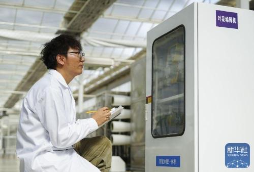 ↑6月25日,在新疆阿克苏地区库车市甬库同心村智慧农业植物工厂,工作人员在检查农作物生长情况。