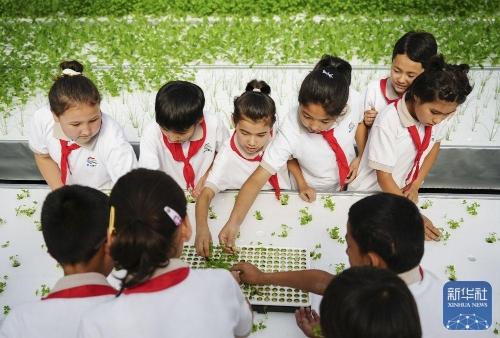 ↑6月25日,在新疆阿克苏地区库车市甬库同心村智慧农业植物工厂,当地小学生体验无土栽培。