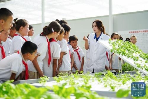 ↑6月25日,在新疆阿克苏地区库车市甬库同心村智慧农业植物工厂,工作人员为当地小学生讲解无土栽培技术。