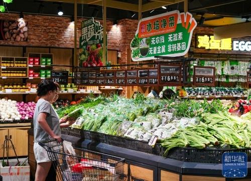 ↑6月25日,在新疆阿克苏地区库车市美连美超市,人们在选购甬库同心村智慧农业植物工厂的农产品。