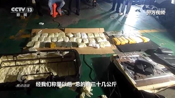 云南德宏边境管理支队瑞丽边境管理大队民警:“那个靠背给它打开看了一下,就发现有东西。经我们称量以后,总的有三十几公斤,其中海洛因有7公斤多,还有氯胺酮,一种新型毒品,它有8公斤,还有15公斤的方言说的麻古,就是甲基苯丙胺的片剂。”