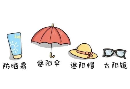 打遮阳伞、戴遮阳帽和遮阳镜,涂抹防晒霜,减少在太阳直射下的户外活动时间。