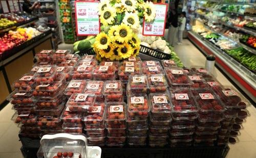 ↑这是6月21日在阿联酋迪拜温超超市拍摄的荔枝货架。
