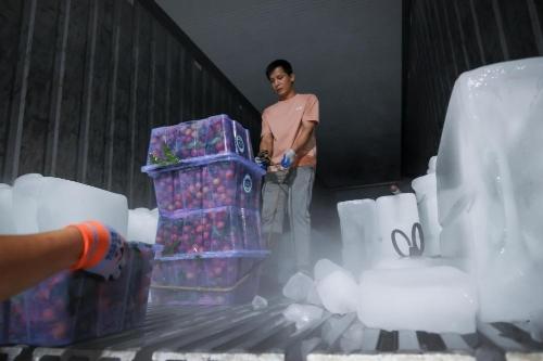 ↑6月4日,在广东茂名高州市广东铭景农业发展有限公司,工人将荔枝装入放置了冰块的冷链车。