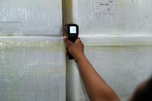 ↑6月20日,在阿联酋迪拜温超超市仓库,工作人员对刚刚空运到货的荔枝箱测温。