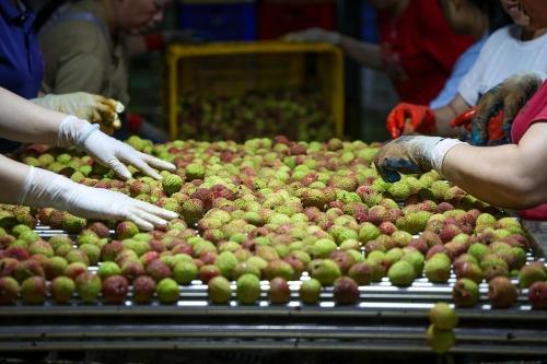 ↑6月4日,在广东茂名高州市广东铭景农业发展有限公司,工作人员在车间分拣即将运往海外的荔枝。