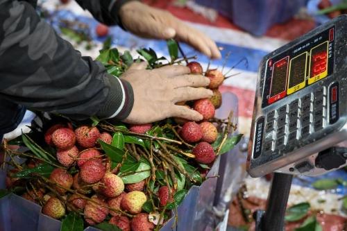 ↑6月4日,在广东茂名高州市广东铭景农业发展有限公司,工作人员对即将运往海外的荔枝进行称重。
