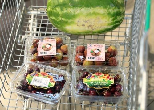 ↑这是6月21日在阿联酋迪拜温超超市拍摄的顾客购物车里的荔枝。