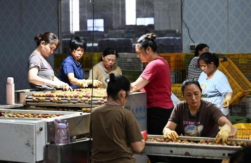 ↑6月4日,在广东茂名高州市广东铭景农业发展有限公司,工作人员在车间分拣荔枝。