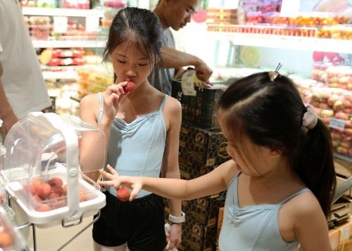 ↑6月20日,在阿联酋迪拜温超超市,小朋友品尝荔枝。