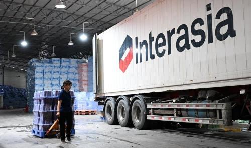 ↑6月4日,在广东茂名高州市广东铭景农业发展有限公司,工作人员搬运打包好的出口荔枝经过冷链集装箱货车。