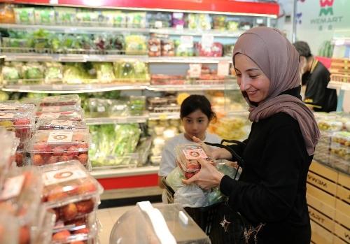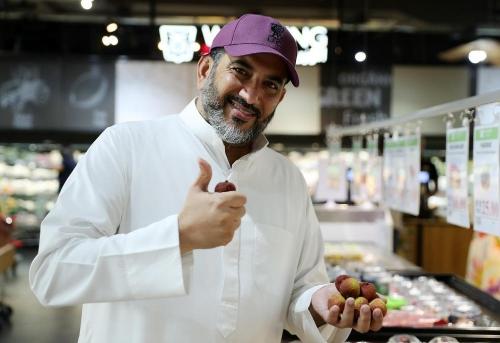 ↑6月21日,在阿联酋迪拜温超超市,菲律宾裔顾客品尝荔枝后竖起大拇指。
