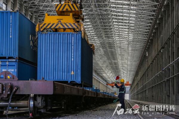 6月24日,工作人员在阿拉山口站中欧(中亚)班列换装区指挥行车吊装集装箱。