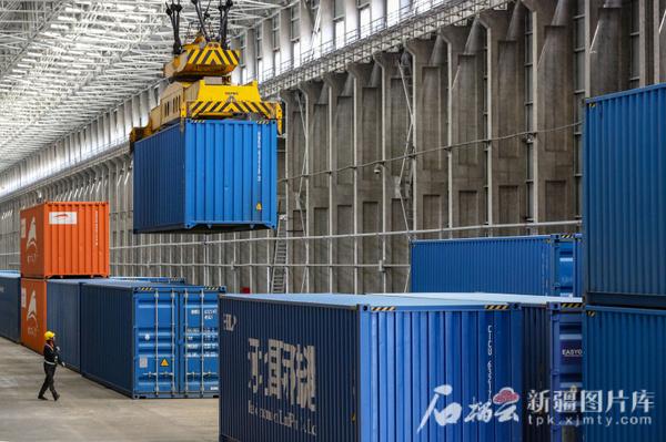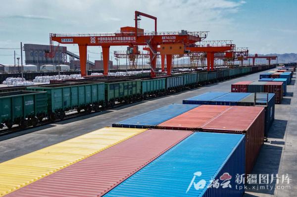 6月24日,阿拉山口站中欧(中亚)班列换装区龙门吊往来穿梭,吊装货物。