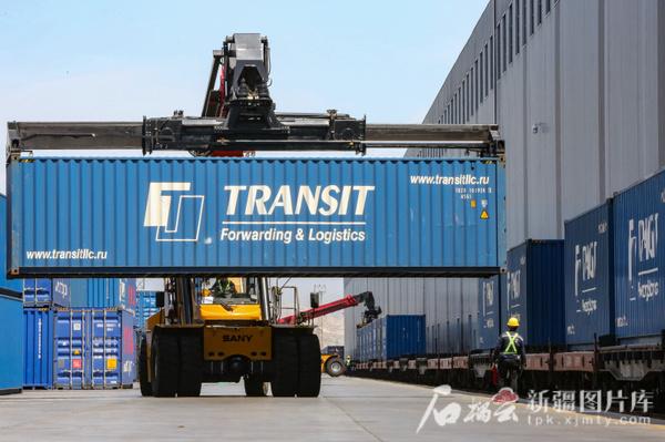 6月24日,阿拉山口站中欧(中亚)班列换装区正面吊转运集装箱。