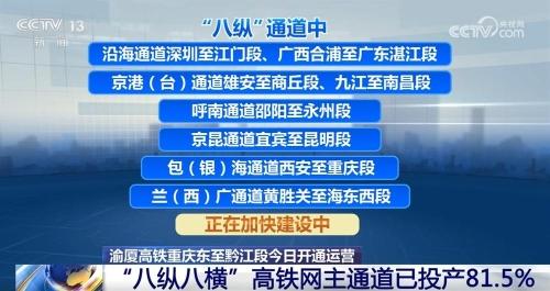 “八纵”通道中沿海通道深圳至江门段、广西合浦至广东湛江段、京港(台)通道雄安至商丘段、九江至南昌段、呼南通道邵阳至永州段、京昆通道宜宾至昆明段、包(银)海通道西安至重庆段、兰(西)广通道黄胜关至海东西段正在加快建设中,包(银)海通道延安至西安段预计年内通车。“八横” 通道中沿江通道成都至达州至万州高速铁路正在建设,京兰通道包头至惠农段、沿江通道武汉至宜昌段预计年内通车。