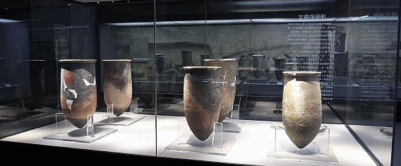 “这是一件出土于安徽蒙城新石器时代尉迟寺遗址的大口陶尊,距今大约4800年。”讲解员指着一件陶器展品,“它的特别之处是器物上有着刻画符号,分别是‘日’‘月’‘山’形。抽象的表达和组合,已经超越了简单的图画,使我们看到了汉字的雏形。”