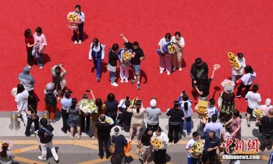 资料图:6月10日,北京市首师大附中通州校区考点外,考生走出考点接受亲人的祝福。中新社记者 杨可佳 摄