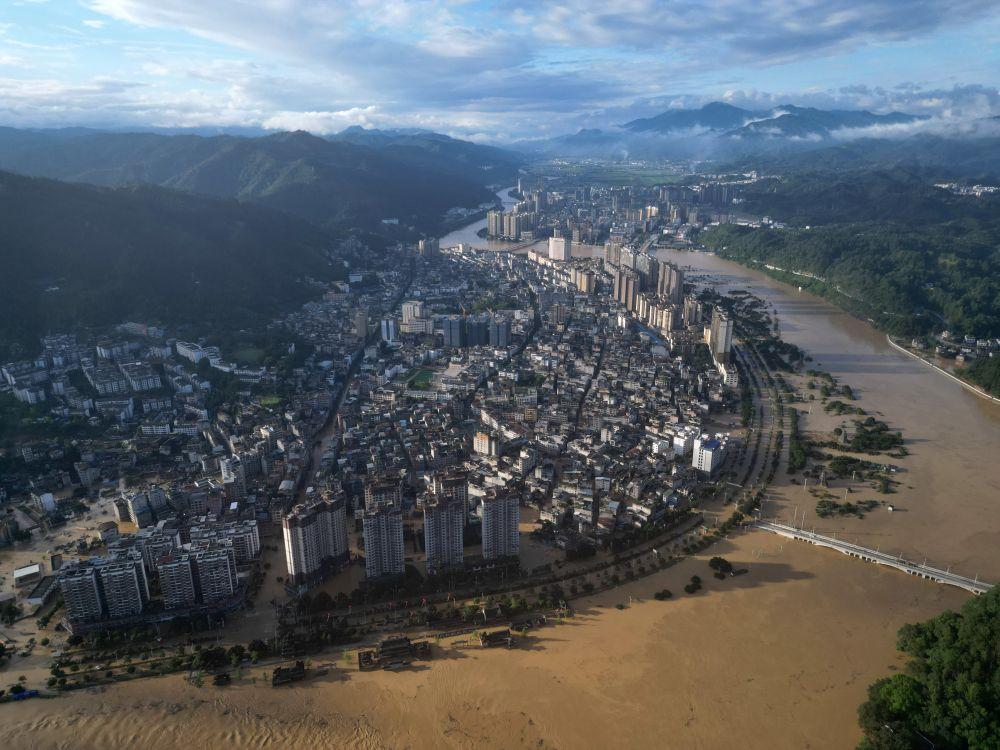 洪水中的榕江县城(6月28日摄,无人机照片)。新华社记者 刘续 摄