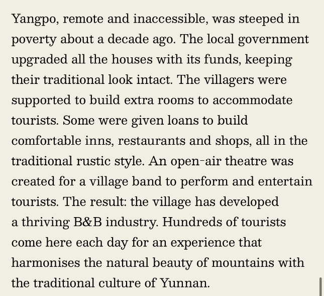 文章以怒江曾经的贫困村——阳坡村为例说,当地政府拨款改造了这里的所有房屋。村民们得到支持,增建了房间,用于接待游客。一些村民则获得贷款,修建了舒适的旅馆、餐厅和商店,全部保留了传统的乡村风格。村里还建了一个露天剧场,供乡村乐队表演,为游客带来娱乐项目。最终,村里的旅游业蓬勃发展,每天都有数百名游客来此体验自然山水与云南传统文化的和谐统一。