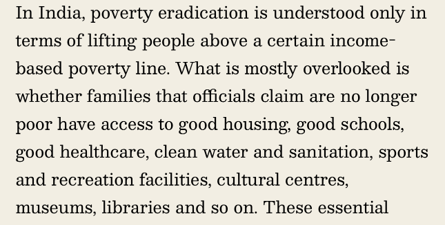 文章认为,在印度,人们通常将消除贫困理解为摆脱某一收入贫困线。人们往往忽视的是,不再贫困的家庭是否能够获得良好的住房、良好的学校、良好的医疗保健、清洁的水和卫生设施、体育和娱乐设施、文化中心、博物馆、图书馆等等。但中国的扶贫战略是全方位的。它不仅提高了贫困群众的收入,也全面改善了他们的生活质量。