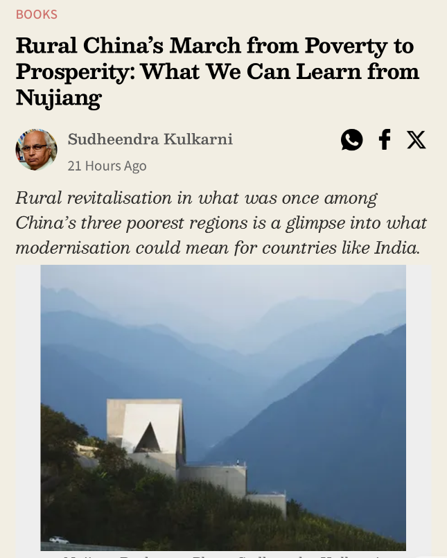 文章认为,到访中国的外国人通常将中国式现代化与世界最大的机场和火车站、世界最快的流线型高铁,以及中国城市中跻身世界前列的、令人叹为观止的摩天大楼联系在一起。但作者却认为,现代化的中国还有其他更鼓舞人心的故事,比如它们可以由怒江这样的地方讲述,展现一个古老文明是如何与时俱进、并借助现代科技的力量和现代视野焕发新生的。这些故事,都值得印度学习。