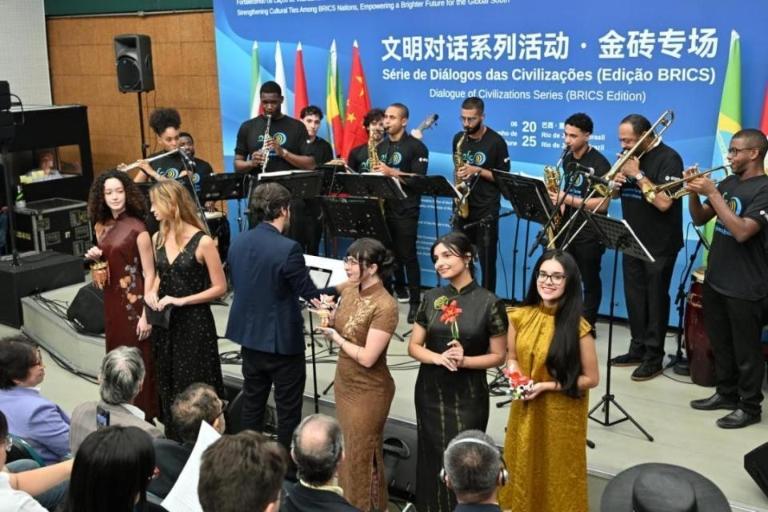 上午10点,由中国国务院新闻办公室和巴西里约热内卢州议会主办的文明对话系列活动(金砖专场)以金砖国家友好故事会拉开帷幕。伴随着巴西科帕卡巴纳要塞管弦乐团的金砖国家流行歌曲联奏的节奏旋律,五名模特身穿香云纱旗袍拾级而下,她们手持3D金属拼图千角灯、劳拉手办等东莞潮玩,掀起活动现场的首个高潮。