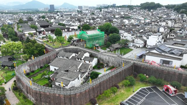 6月19日,周虎在歙县徽州古城南谯楼保养维护工程现场查看。