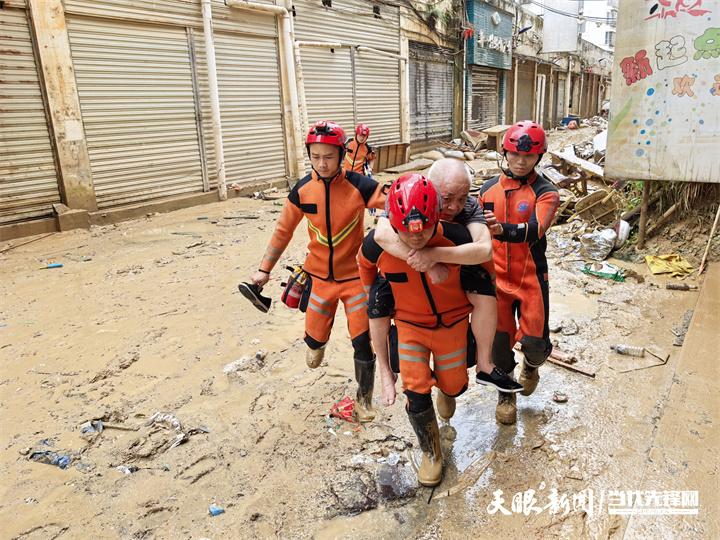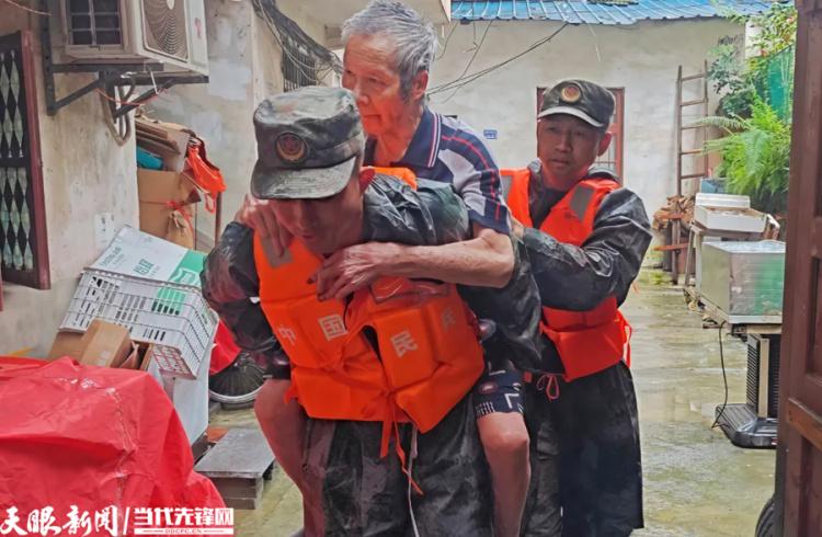 当排查至一间临河房屋时,一位老人微弱的回应让他打了个激灵。“老人家,别慌!我背您出去!”俯身蹲下,稳稳地扶上后背,银发紧贴着他斑白的鬓角,在肆虐的暴雨中紧紧相依,构成一幅温暖的图画。