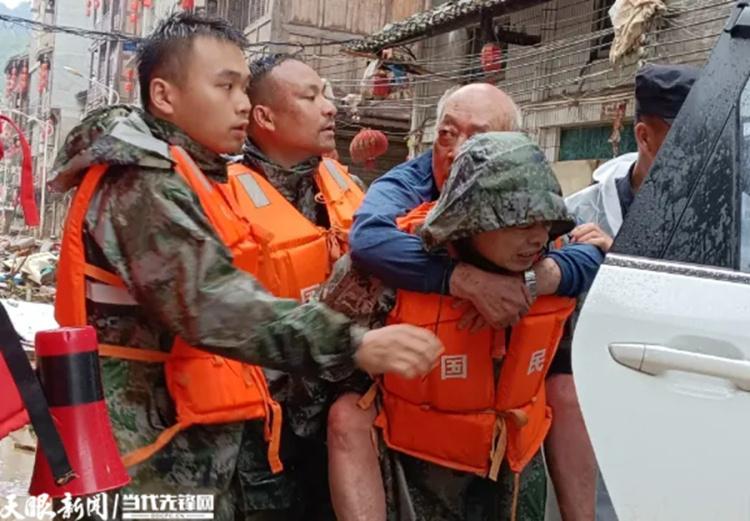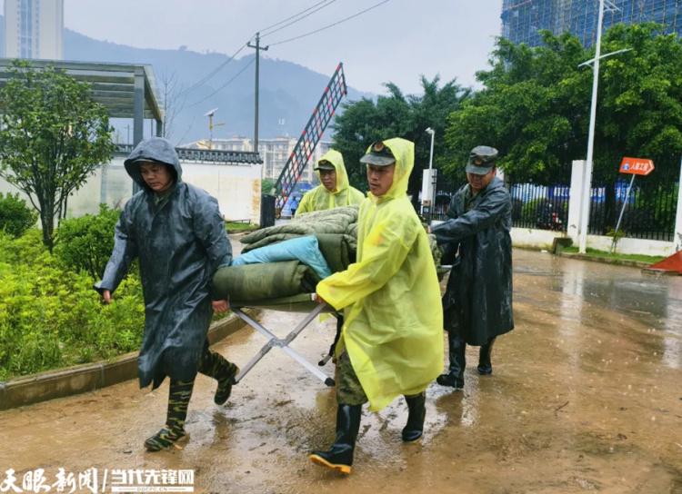 台江县人武部组织110余名官兵民兵分成10个分队,采取喊话劝离、协调车辆等方式,对榕江县城的群众进行紧急撤离。