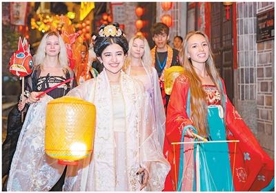 外国游客身着汉服在江西庐山西宁街体验民俗文化。 韩俊烜摄(影像中国)
