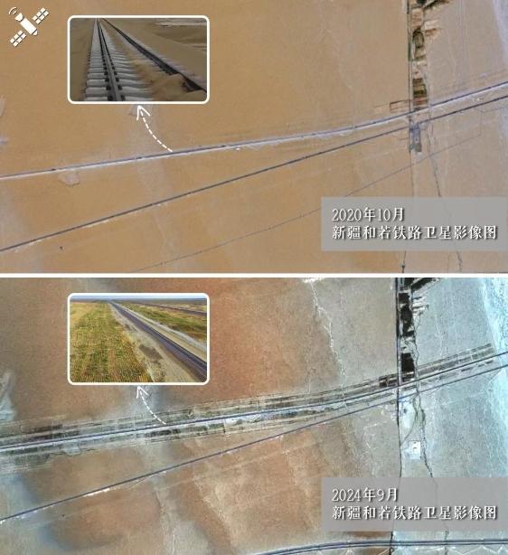 解读:2020年黄沙漫道与2024年绿带护路对比:和若铁路沿线成功筑牢生态屏障。