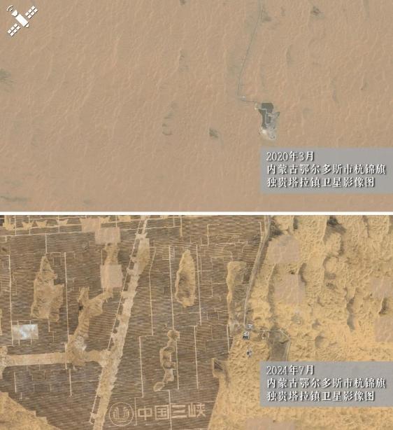 解读:2020年沙丘裸露的荒漠(上图)与2024年光伏治沙工程竣工后的同一区域(下图)对比,荒漠已变生态屏障。