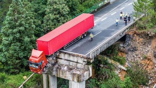 唯一把车开到断桥处的,是一辆在双向交通管制前已进入管控路段的红色货车。“车头一走到那里,就感觉下沉了一点,我马上踩刹车,但车子还是有惯性,车头出去了。”货车司机游国春说,如果没有交通管制,后面随便来一个车,都有可能把货车顶下80米的深谷。