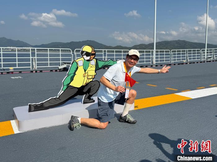 “能麻烦你帮我和‘航母Style’合影吗?”香港英华书院的张老师模仿着立牌的模样:侧蹲屈腿,左臂前伸,食指与中指并拢指向起飞方向,请记者帮忙拍摄他和立牌的合影。他兴奋地说,人生第一次参观解放军军舰就来到山东舰,感到非常幸运,让自己更直观地了解了国家国防建设成就。