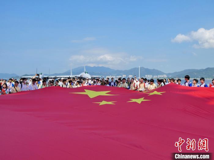 “同学们,我们一起举起这面国旗好吗?”说话间,一面巨幅国旗在山东舰官兵和孩子们的擎举下徐徐铺开,伴随着乐曲声,五星红旗在相当于2个标准足球场大的山东舰飞行甲板上“流动”起来,成为一道独特风景。