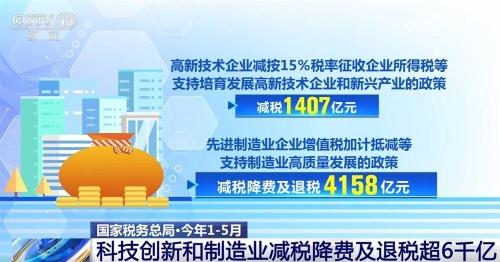 央视网消息:国家税务总局7月4日公布的最新数据显示,1—5月,科技创新和制造业减税降费及退税超6000亿元,在结构性减税降费政策有力推动下,我国科技创新与制造业高质量发展加快推进。数据显示,今年1—5月,现行支持科技创新和制造业发展的主要政策减税降费及退税达6361亿元。其中,高新技术企业减按15%税率征收企业所得税等支持培育发展高新技术企业和新兴产业的政策减税1407亿元;先进制造业企业增值税加计抵减等支持制造业高质量发展的政策减税降费及退税4158亿元。