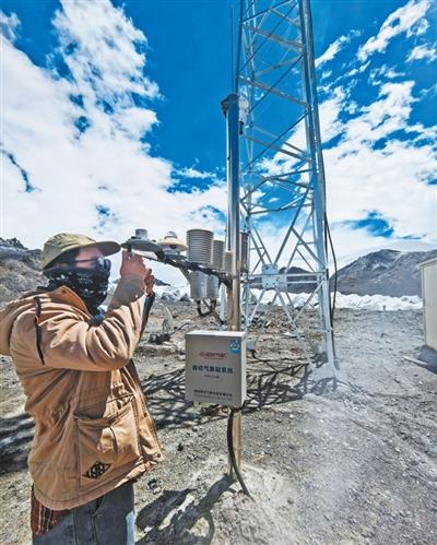 安多县的气象装备保障人员在格拉丹东自动气象站开展维护保障工作。安多县气象局供图