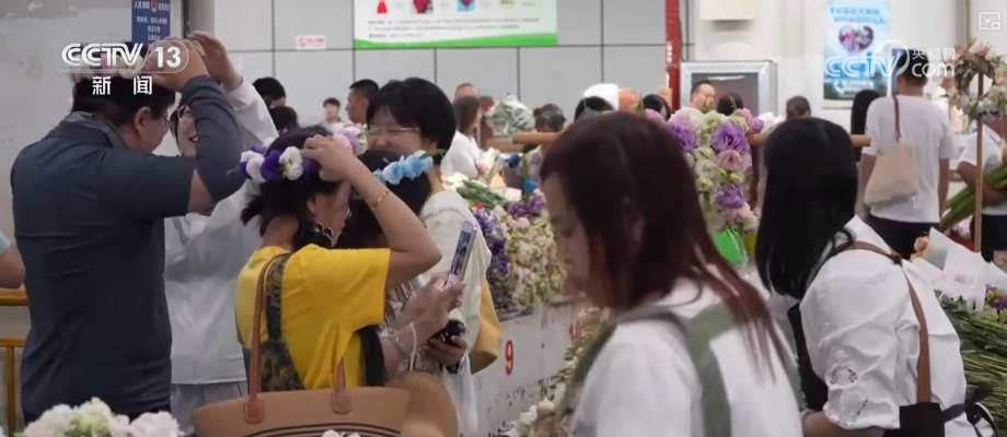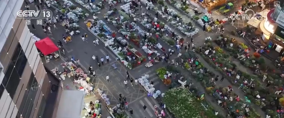 伴随着夜幕降临,除了白天部分固定摊位的摊主开始营业,许多来自周边地区的花农和鲜花商户也争先恐后拉着小推车,满载着鲜切花进入市场。“走播带货”的鲜花电商主播头戴花环,手捧鲜花的市民游客也紧跟其后、络绎不绝。整个市场铺满了鲜花,走进其中芳香扑鼻。