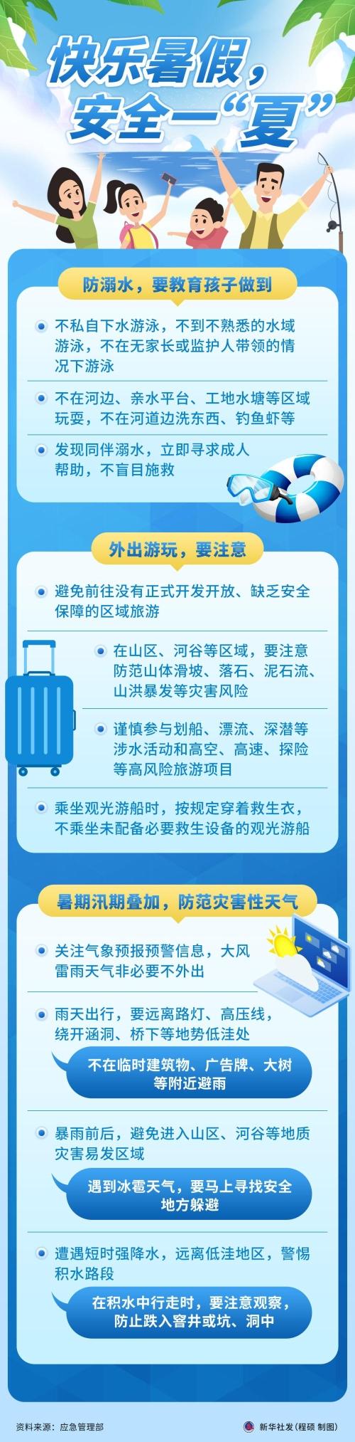 各地中小学生陆续迎来暑假,暑期、汛期叠加,安全风险隐患增多。快乐过暑假,安全不放假。这份暑期安全提示请收好。