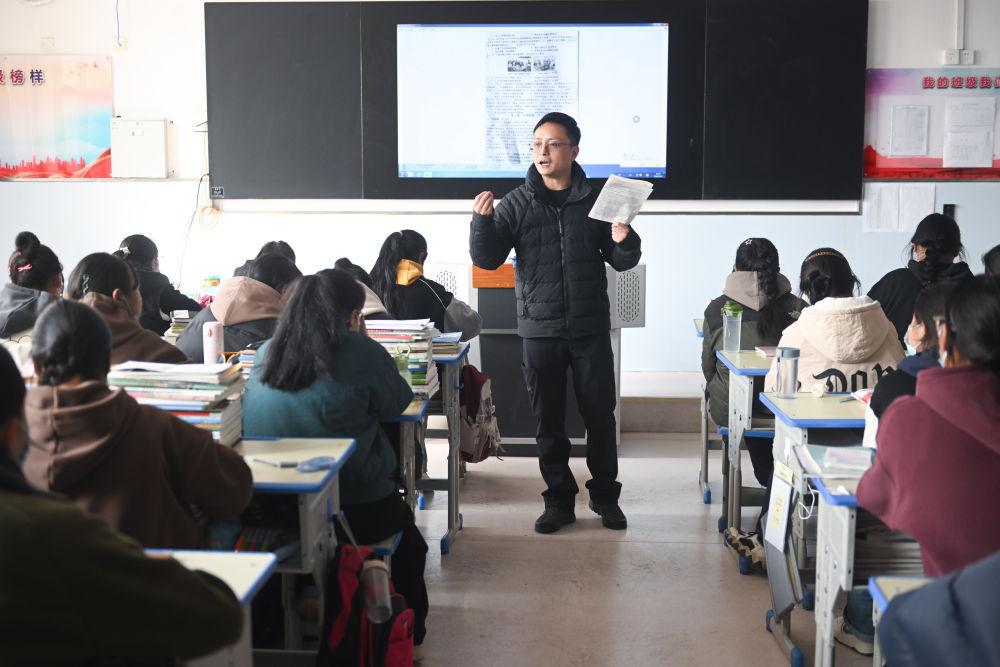 上海援青教师钟祖华在给果洛中学学生上课(2023年2月23日摄)。 新华社记者 张龙 摄