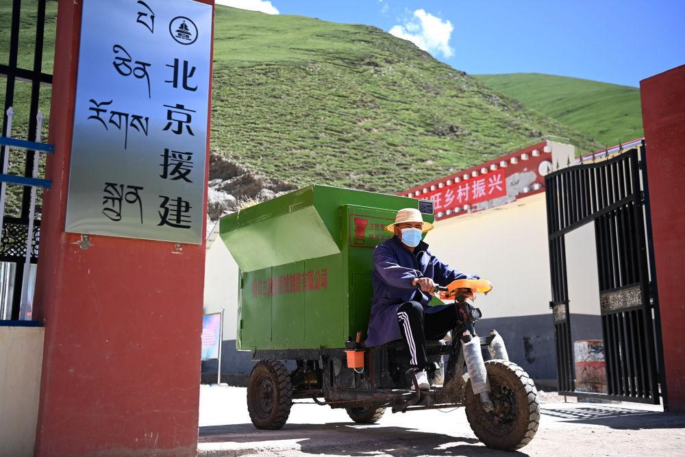 在青海省玉树藏族自治州称多县歇武镇牧业村的牦牛养殖基地,工作人员驾驶自动撒料车驶向牛舍(2022年7月4日摄)。 新华社记者 范培珅 摄