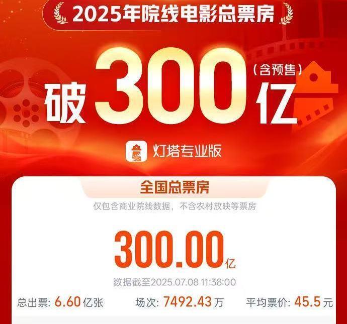 据网络平台数据,截至7月8日11时38分,历时189天,2025年电影大盘票房(含预售)突破300亿,相较去年提前28天。
