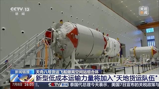北京时间2025年7月8日15时9分,天舟八号货运飞船顺利撤离空间站组合体,转入独立飞行阶段,将于近期择机受控再入大气层。天舟八号货运飞船于2024年11月15日在文昌航天发射场发射入轨,共计在轨运行近八个月,为神舟十九号、二十号乘组提供了物资保障。通过短片,一起回顾天舟八号的任务过程。